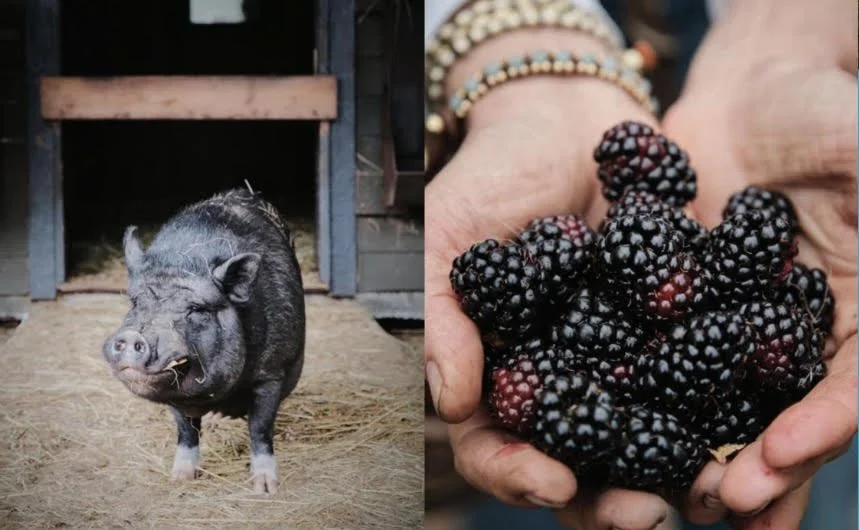 The farm also features goats, lots of colorful chickens and an orchard and big organic garden that guests are encouraged to harvest.